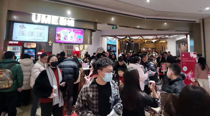 2月14日,UME影城(南通中南CBD店)等候區(qū)人流如織。(受訪對象供圖)