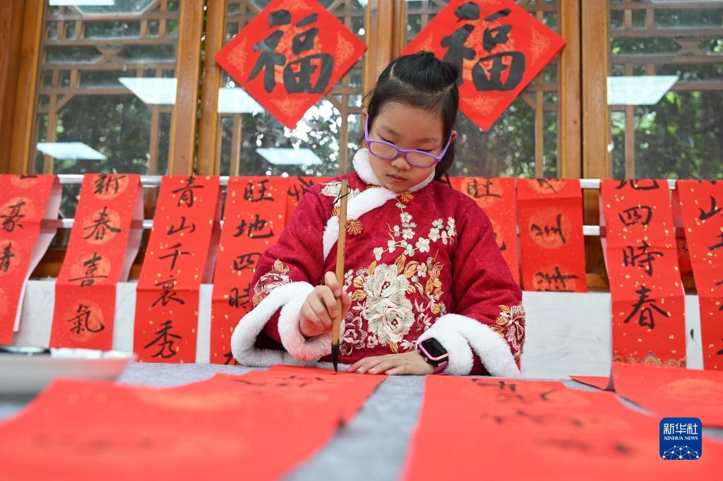 1月12日,在四川省內(nèi)江市東興區(qū)東興老街,一名小朋友在寫春聯(lián)。新華社發(fā)(唐明潤攝)
