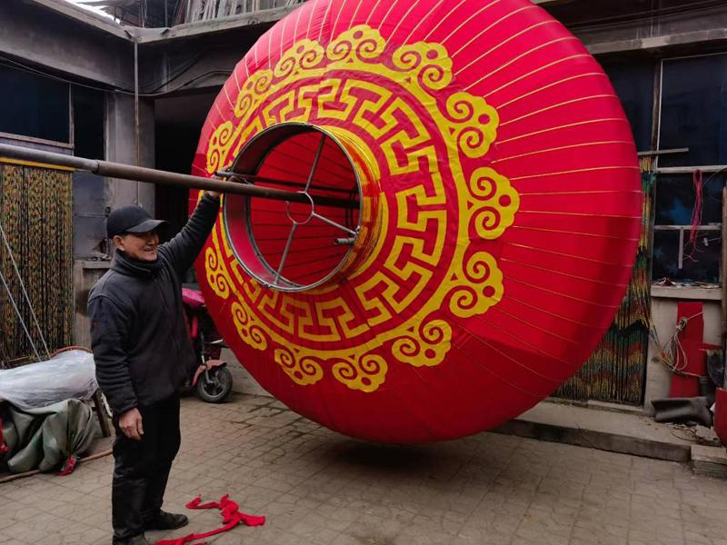 “這個規(guī)格是3米的,算是中等大小。”白軍平熟練地?fù)伍_了一個大紅燈籠。打小跟老人學(xué)燈籠技藝,白軍平最擅長制作各種規(guī)格的大燈籠。