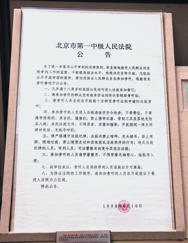 1998年6月,北京市第一中級人民法院公開宣布,18歲以上的公民可持身份證自由旁聽公開審理的案件。圖為當時發(fā)布的公告。視覺中國供圖