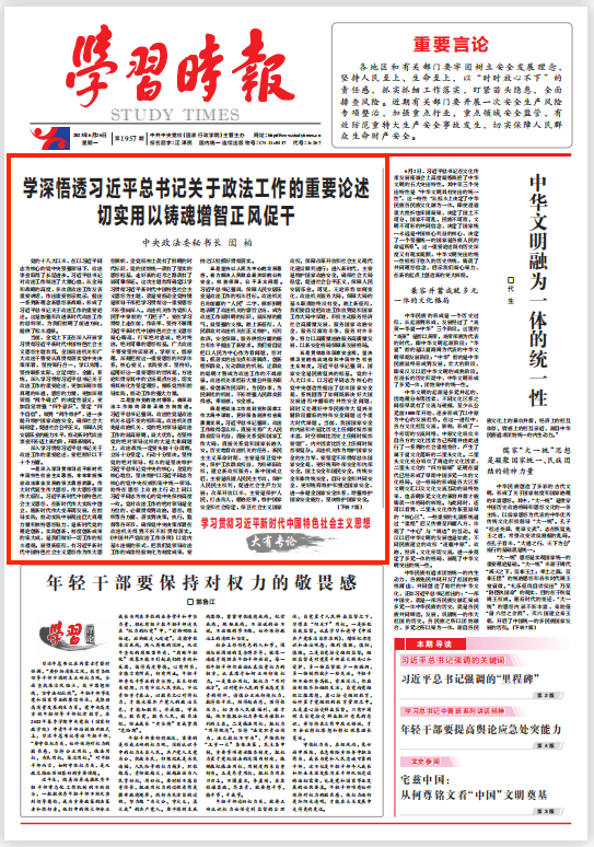 當(dāng)前,全黨上下正在深入開(kāi)展學(xué)習(xí)貫徹習(xí)近平新時(shí)代中國(guó)特色社會(huì)主義思想主題教育。全國(guó)政法機(jī)關(guān)和廣大政法干警要認(rèn)真貫徹落實(shí)黨中央決策部署,堅(jiān)持知行合一、學(xué)以致用,堅(jiān)持聯(lián)系實(shí)際、立足崗位,全面、系統(tǒng)、深入學(xué)習(xí)貫徹習(xí)近平總書記關(guān)于政法工作的重要論述,更加深刻體悟真理的味道、思想的力量,更加深刻領(lǐng)悟“兩個(gè)確立”的決定性意義,更加自覺(jué)增強(qiáng)“四個(gè)意識(shí)”、堅(jiān)定“四個(gè)自信”、做到“兩個(gè)維護(hù)”,進(jìn)一步提升維護(hù)國(guó)家政治安全、確保社會(huì)大局穩(wěn)定、促進(jìn)社會(huì)公平正義、保障人民安居樂(lè)業(yè)的能力水平,推動(dòng)新時(shí)代政法事業(yè)不斷邁上新臺(tái)階、開(kāi)辟新境界。