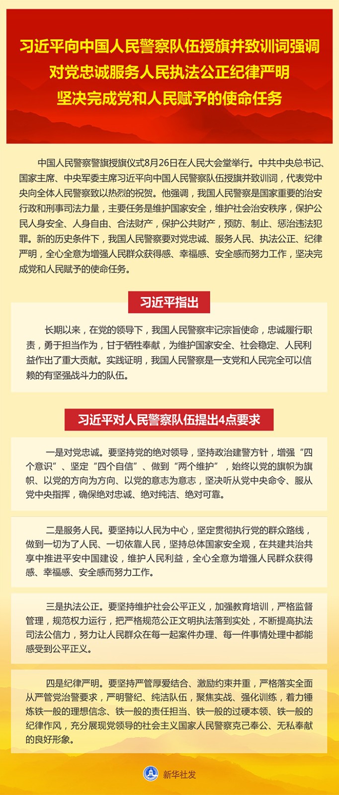 新華社北京8月26日電 中國人民警察警旗授旗儀式26日在人民大會堂舉行。中共中央總書記、國家主席、中央軍委主席習(xí)近平向中國人民警察隊伍授旗并致訓(xùn)詞,代表黨中央向全體人民警察致以熱烈的祝賀。他強調(diào),我國人民警察是國家重要的治安行政和刑事司法力量,主要任務(wù)是維護國家安全,維護社會治安秩序,保護公民人身安全、人身自由、合法財產(chǎn),保護公共財產(chǎn),預(yù)防、制止、懲治違法犯罪。新的歷史條件下,我國人民警察要對黨忠誠、服務(wù)人民、執(zhí)法公正、紀律嚴明,全心全意為增強人民群眾獲得感、幸福感、安全感而努力工作,堅決完成黨和人民賦予的使命任務(wù)。