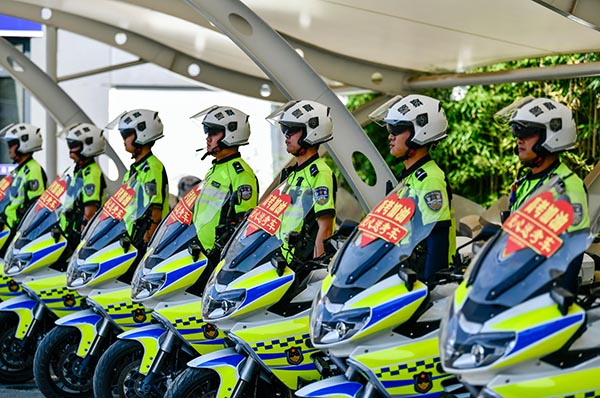 6月6日,山東省棗莊市臺兒莊公安分局交警大隊民警在車輛上粘貼愛心送考標識。今年高考期間,山東省棗莊市臺兒莊公安分局交警大隊組織了14輛“愛心送考車”在高考考點疏導(dǎo)交通,處理突發(fā)事件,為考生愛心護考。