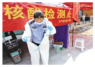 圖④ 民警在中風險地區(qū)執(zhí)勤時,抽空解開防護服,抖落身上的汗水。