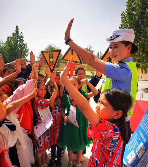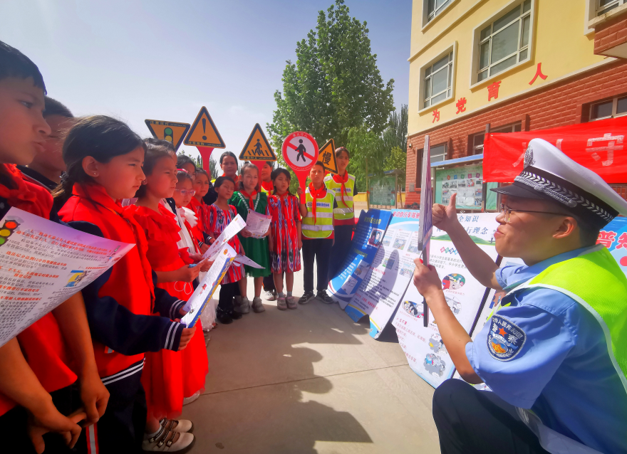 圖為和田市公安局黨員民警志愿服務(wù)隊(duì)的交警來(lái)到古江巴格鄉(xiāng)紅星村小學(xué),向?qū)W生宣傳交通安全知識(shí)。