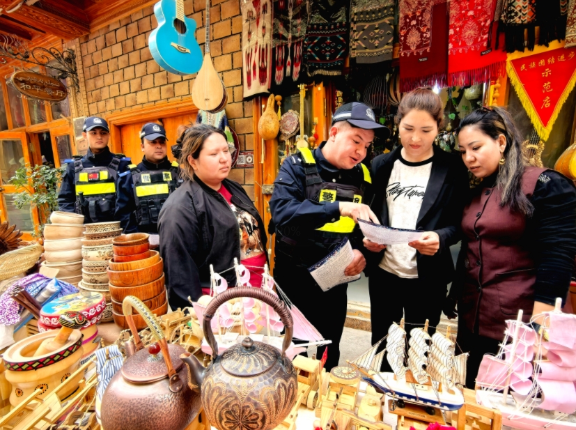 圖為和田市公安局團城便民警務(wù)站民輔警在團城景區(qū)向游客和景區(qū)商戶開展防范電信網(wǎng)絡(luò)詐騙普法宣傳活動。