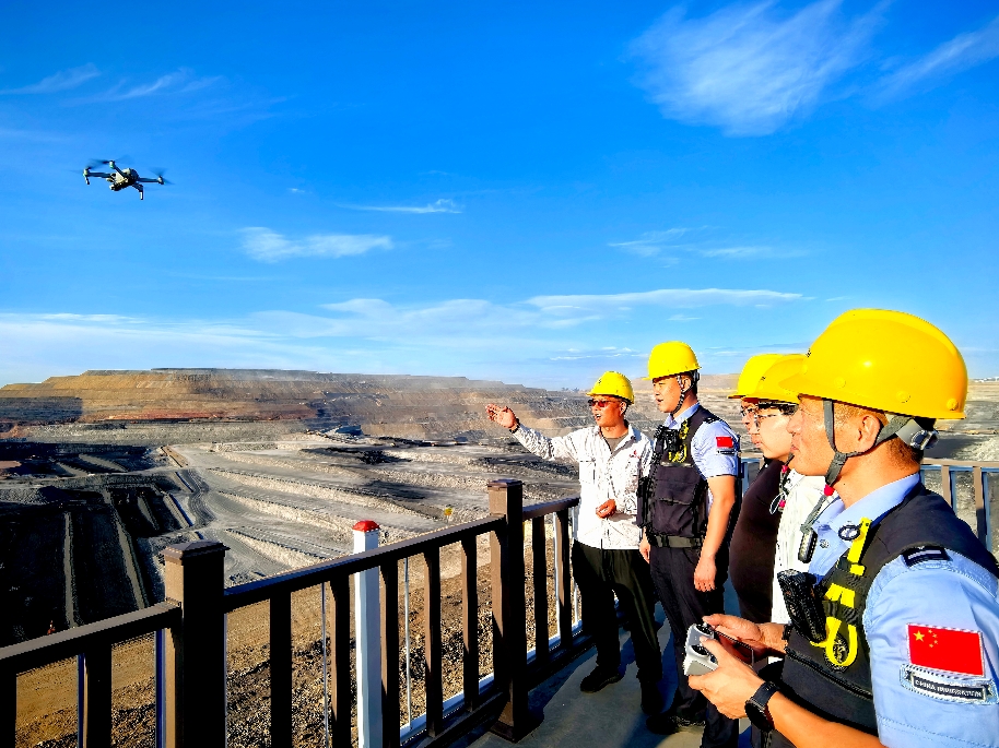 圖為8月5日下午,北山煤礦邊境派出所聯(lián)合當(dāng)?shù)刈匀毁Y源等部門啟用警用無人機進行空中巡檢排查。
