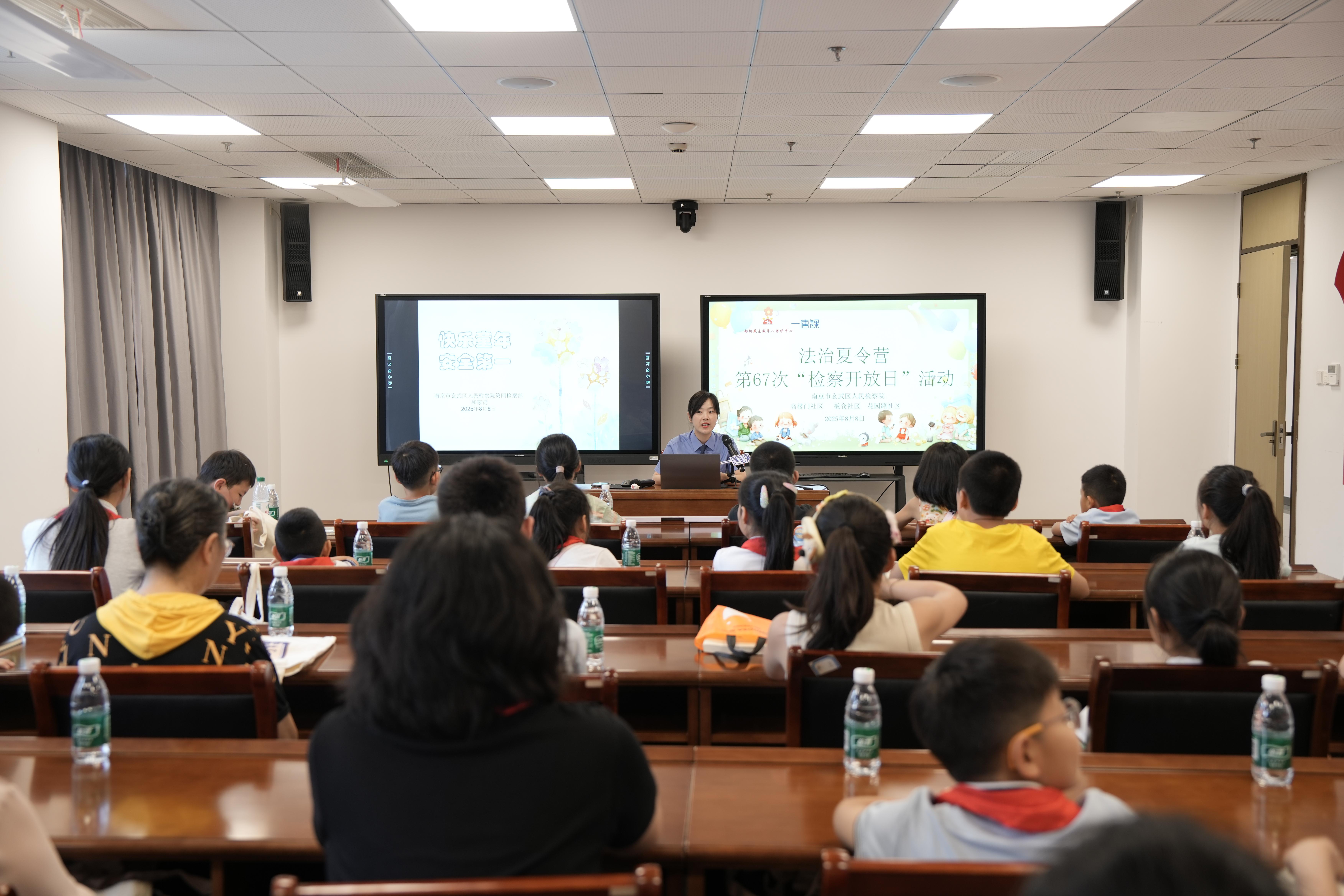 8月8日下午,來自江蘇省南京市玄武區(qū)3個社區(qū)的20余名小朋友在家長與社區(qū)志愿者的陪伴下,來到了南京市玄武區(qū)人民檢察院,開啟了一場別開生面的沉浸式法治教育之旅。