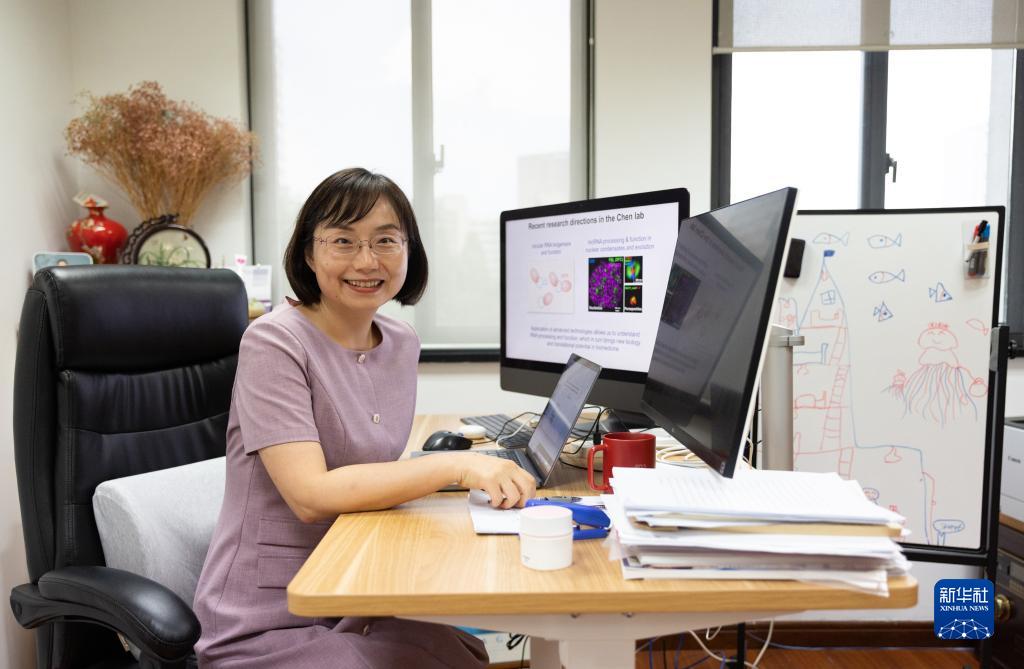 陳玲玲在中國科學院分子細胞科學卓越創(chuàng)新中心辦公室留影,右側是她女兒的畫作(2022年8月11日攝)。新華社記者 金立旺 攝