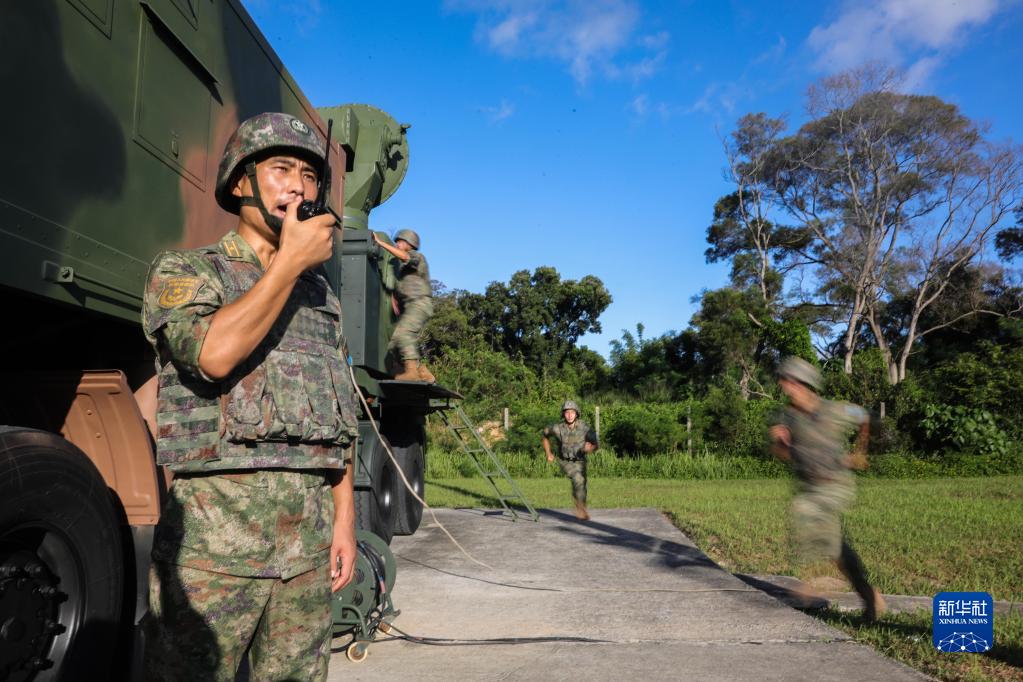 某次演訓(xùn)中,駐香港部隊(duì)某團(tuán)防空營(yíng)營(yíng)長(zhǎng)王海旭(前)下達(dá)“發(fā)射”防空導(dǎo)彈命令(2022年7月21日攝)。新華社發(fā)(田越洋 攝)