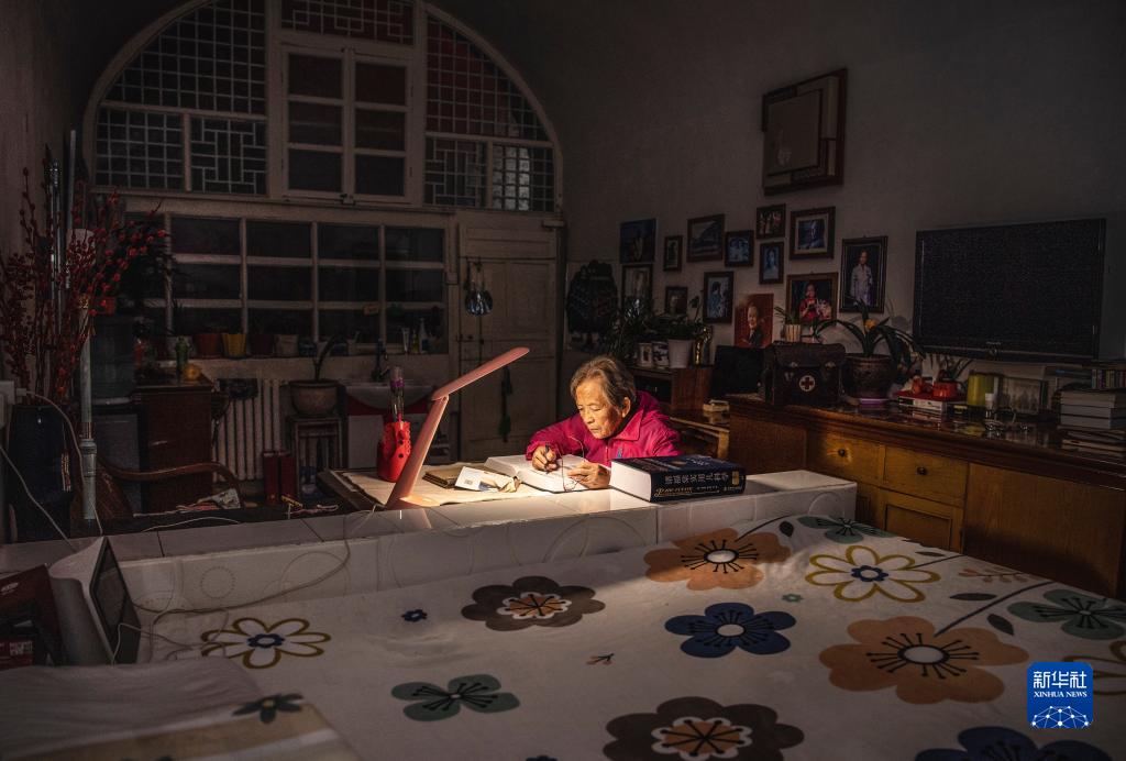 路生梅在窯洞里挑燈學(xué)習(xí)(2022年9月16日攝)。新華社記者 陶明 攝
