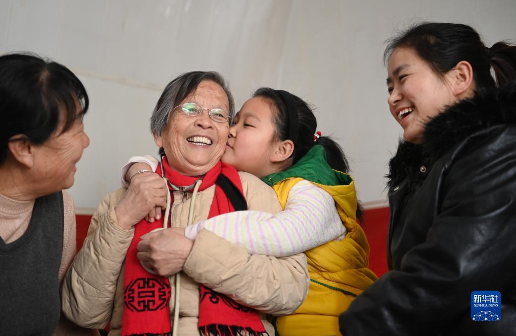 路生梅(左二)在陜西佳縣佳州街道凌云社區(qū)義診時,張宇旋親密擁抱她(2021年1月17日攝)。張宇旋的媽媽(右一)、奶奶(左一)都曾讓路生梅看過病。新華社記者 陶明 攝