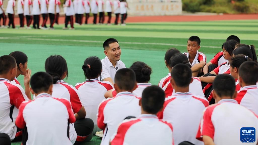 貴州省望謨縣實(shí)驗(yàn)高中黨總支副書記、副校長劉秀祥在新生軍訓(xùn)間隙,和學(xué)生們聊天(2022年8月26日攝)。新華社記者 周宣妮 攝