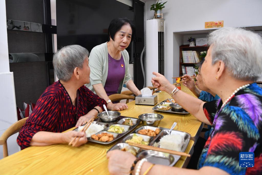 在福建省福州市軍門社區(qū)長(zhǎng)者食堂內(nèi),林丹(左二)與用餐的老人交流(2022年9月9日攝)。新華社記者 姜克紅 攝