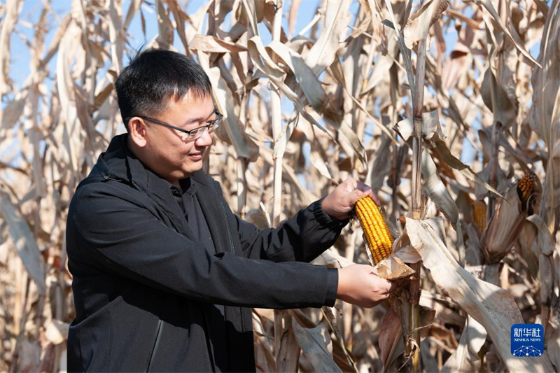 10月16日,黑龍江省寶清縣農(nóng)業(yè)農(nóng)村局副局長(zhǎng)張強(qiáng)在農(nóng)田中查看玉米成熟情況。新華社發(fā)(鄂麗霞 攝)