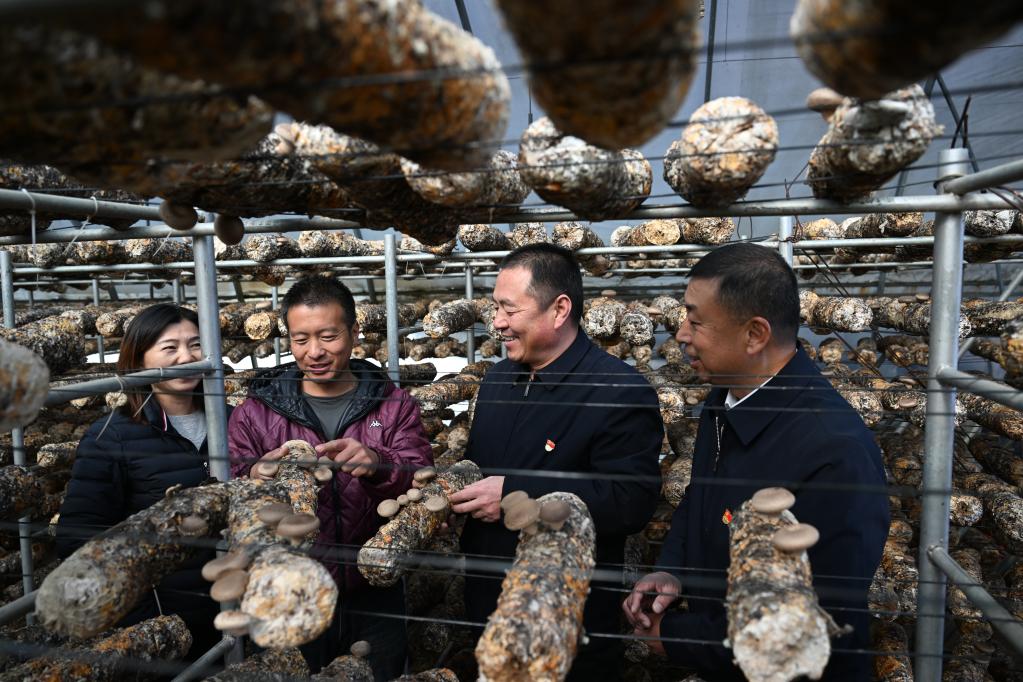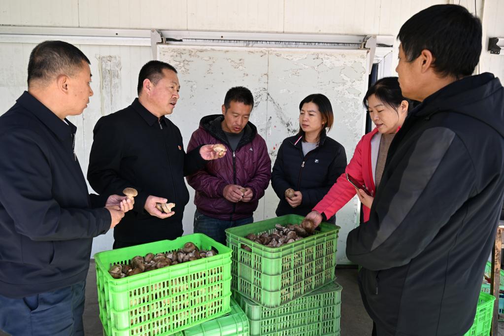 顧瑞利(右二)從北京返回村后到食用菌大棚了解香菇長勢。