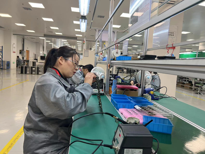 在國(guó)盾量子生產(chǎn)基地的高低溫環(huán)境實(shí)驗(yàn)室內(nèi),量子通信設(shè)備正在進(jìn)行整機(jī)運(yùn)行測(cè)試。在零部件生產(chǎn)和整機(jī)組裝測(cè)試生產(chǎn)線上,技術(shù)人員正在對(duì)電路板進(jìn)行單板焊接操作和對(duì)產(chǎn)品進(jìn)行檢測(cè)標(biāo)定。
