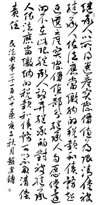 趙金鑄,中國書法家協(xié)會(huì)會(huì)員,中國檢察官文聯(lián)書畫協(xié)會(huì)理事,甘肅省定西市渭源縣人民檢察院黨組書記、檢察長,甘肅省書法家協(xié)會(huì)草書委員會(huì)委員,定西市書法家協(xié)會(huì)副主席,定西檢察官文聯(lián)副主席兼書法家協(xié)會(huì)主席。