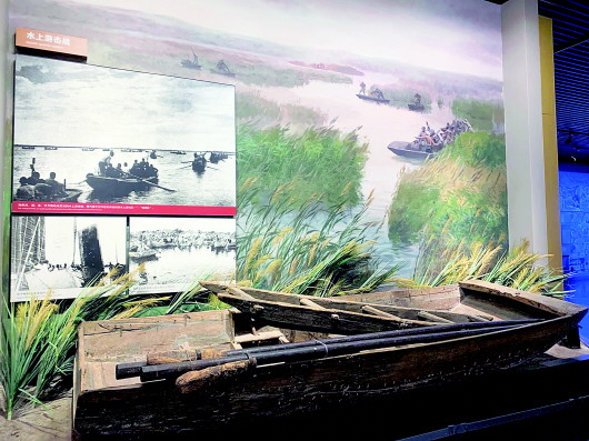 跟隨任京培的步伐,記者看到了紀(jì)念館中陳列的一艘長(zhǎng)約三四米的木船,上面被日軍射擊的累累彈痕印證著歷史。在船上,還有兩把近3米的大抬杠槍。任京培說,這是一種當(dāng)?shù)孬C人發(fā)明的武器,槍筒又長(zhǎng)又粗,不但打得遠(yuǎn),而且火力足威力大。