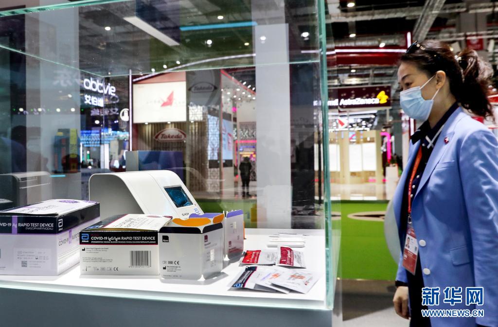 在第三屆中國國際進口博覽會公共衛(wèi)生防疫專區(qū),參觀者觀看雅培展示的便于攜帶且適用于大規(guī)模檢測的新冠病毒快速抗原檢測試劑和產品(2020年11月5日攝)。新華社記者 劉穎 攝