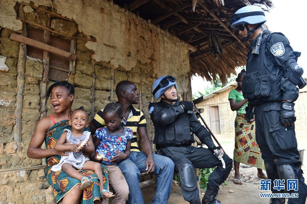 中國維和警察防暴隊隊員在利比里亞格林維爾的一座村莊詢問當地治安等情況(2015年11月3日攝)。新華社記者 孫瑞博 攝
