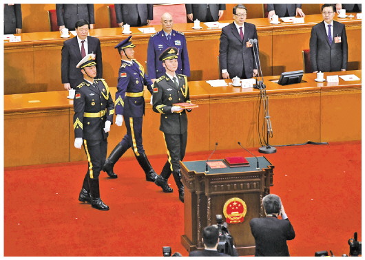 2018年3月17日,十三屆全國人大一次會議憲法宣誓儀式在北京人民大會堂舉行。主席臺上,3名禮兵邁著正步護送《中華人民共和國憲法》入場。 居楊 攝