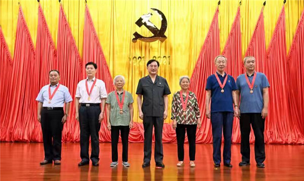 會(huì)場(chǎng)內(nèi),紅旗漫卷,紅色紀(jì)念章閃耀奪目的光芒。頒授儀式在莊嚴(yán)的國(guó)歌聲中正式開(kāi)始。當(dāng)榮獲“光榮在黨50年”紀(jì)念章的老黨員代表們步入會(huì)場(chǎng)時(shí),會(huì)場(chǎng)響起熱烈的掌聲。