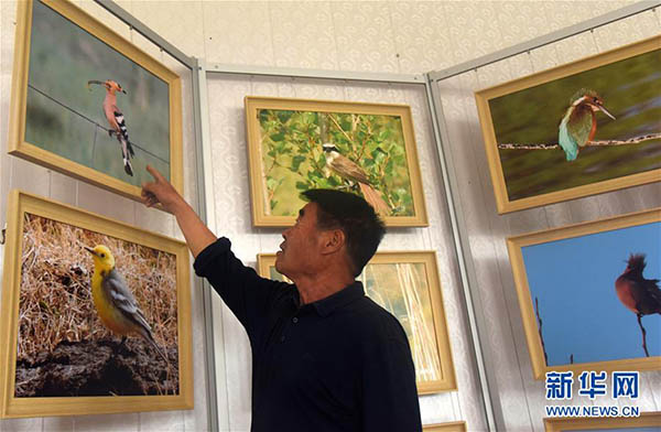 6月7日,廷·巴特爾介紹他在草場(chǎng)拍攝的野生鳥類照片。 新華社記者 恩浩 攝