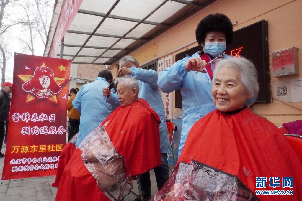 2021年3月5日,北京市豐臺(tái)區(qū)東高地街道的志愿者為社區(qū)內(nèi)的老人理發(fā)。新華社記者 李欣 攝