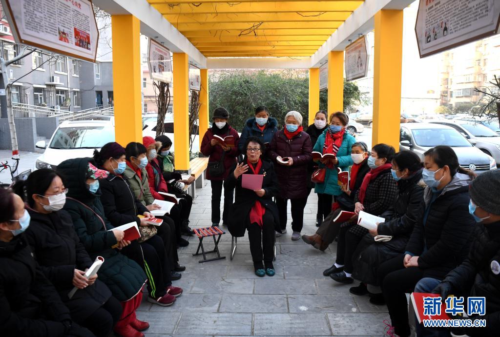 2020年12月22日,河北省石家莊市裕華區(qū)建南社區(qū)年過八十的黨員靳國芳為社區(qū)居民宣講黨的十九屆五中全會(huì)精神。新華社記者 王曉 攝