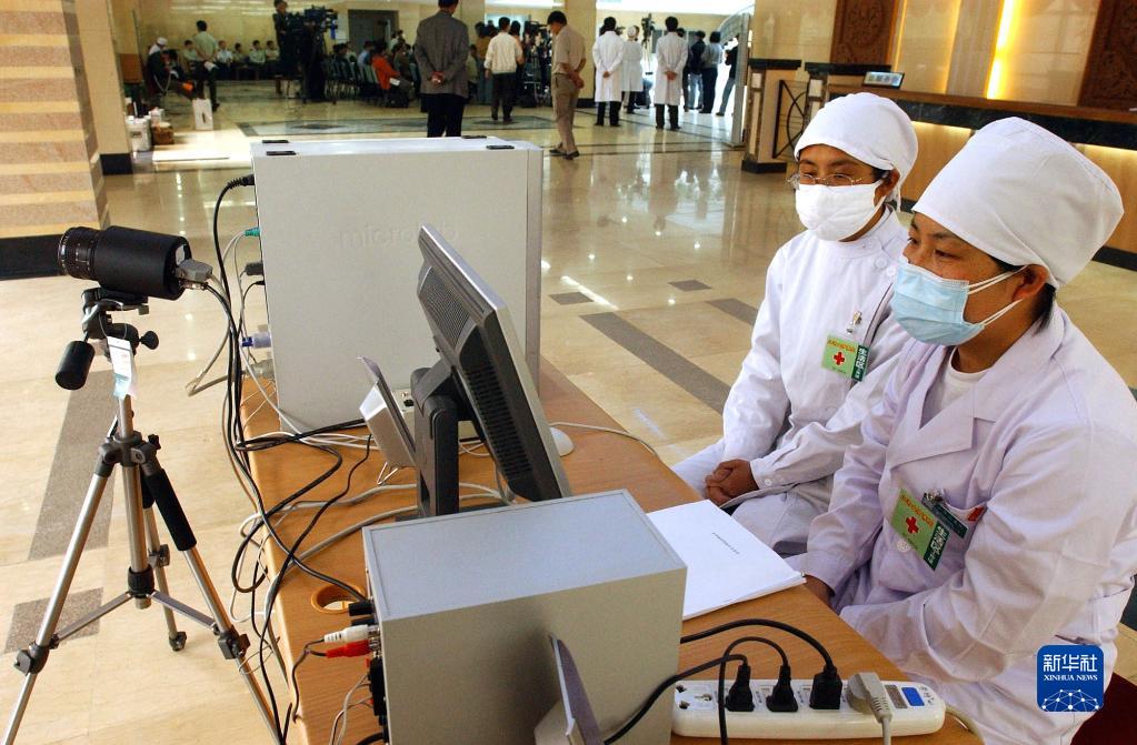 2003年5月7日,北京小湯山“非典”定點(diǎn)醫(yī)院的兩名工作人員在醫(yī)院進(jìn)出口通過(guò)紅外熱成像系統(tǒng)對(duì)進(jìn)出人員進(jìn)行體溫監(jiān)測(cè)。新華社記者 王呈選 攝