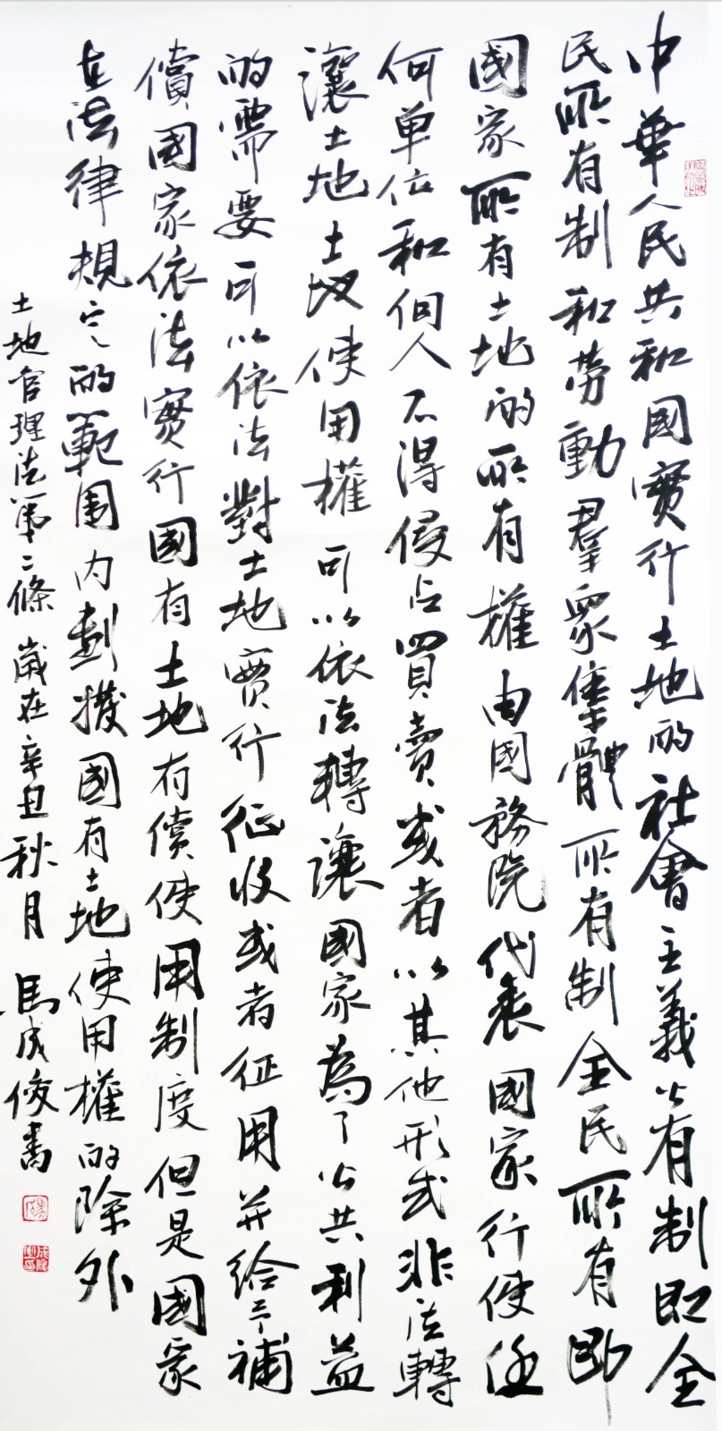 繼1600余位書法家參與書寫《中華人民共和國民法典》全部1260條法條之后,法治日報社聯(lián)合自然資源部法規(guī)司、自然資源部書畫研究會和北京昌平書法家協(xié)會,將筆端對準(zhǔn)土地管理“一法一條例”,即《中華人民共和國土地管理法》和《中華人民共和國土地管理法實施條例》。