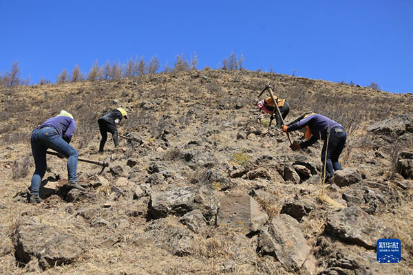 塞罕壩機(jī)械林場(chǎng)工人在石質(zhì)陽(yáng)坡上造林(2016年4月13日攝)。新華社發(fā)