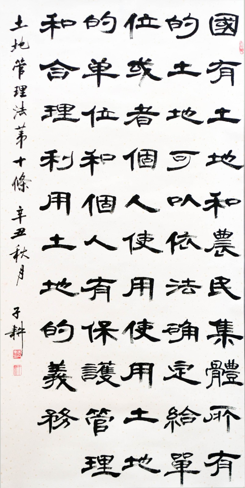繼1600余位書法家參與書寫《中華人民共和國民法典》全部1260條法條之后,法治日?qǐng)?bào)社聯(lián)合自然資源部法規(guī)司、自然資源部書畫研究會(huì)和北京昌平書法家協(xié)會(huì),將筆端對(duì)準(zhǔn)土地管理“一法一條例”,即《中華人民共和國土地管理法》和《中華人民共和國土地管理法實(shí)施條例》。