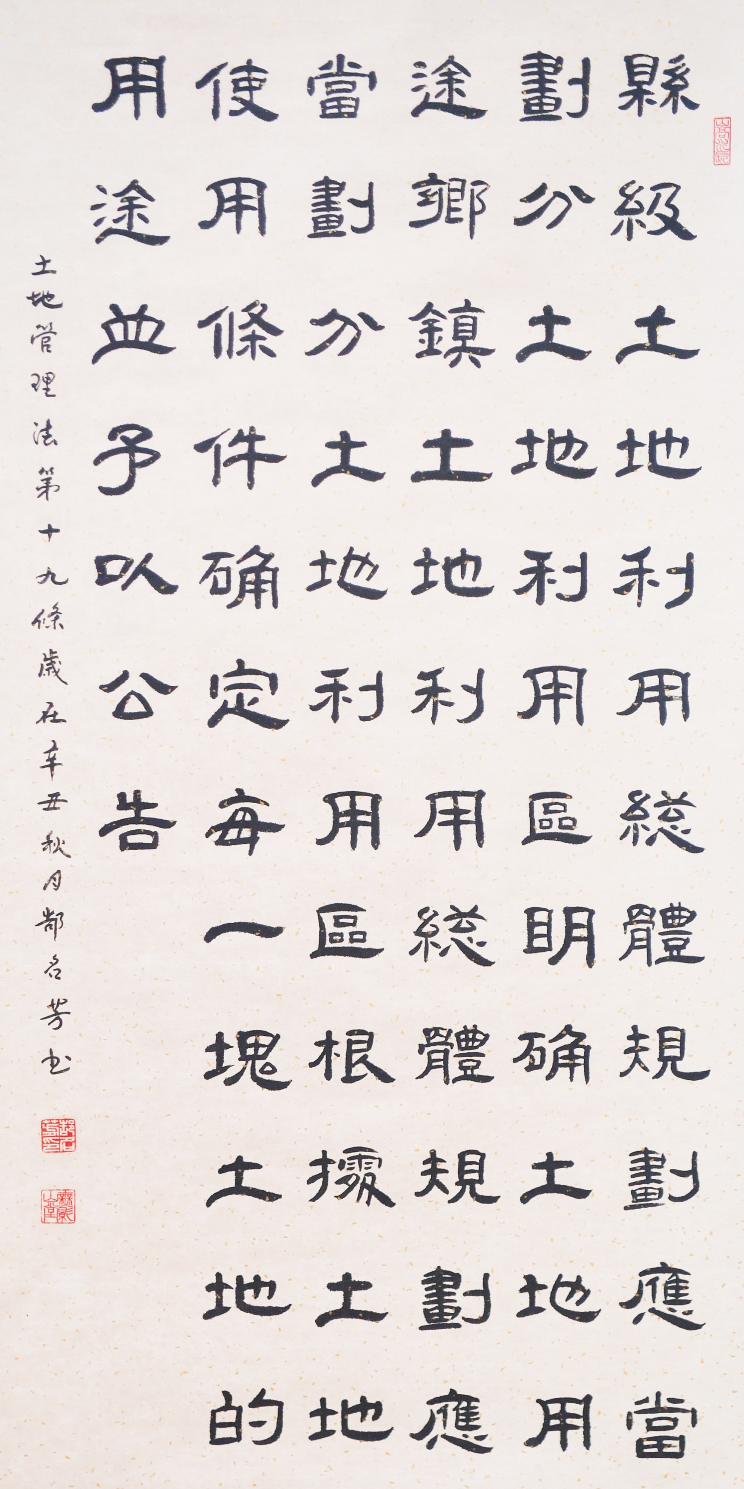 繼1600余位書法家參與書寫《中華人民共和國民法典》全部1260條法條之后,法治日報社聯(lián)合自然資源部法規(guī)司、自然資源部書畫研究會和北京昌平書法家協(xié)會,將筆端對準土地管理“一法一條例”,即《中華人民共和國土地管理法》和《中華人民共和國土地管理法實施條例》。