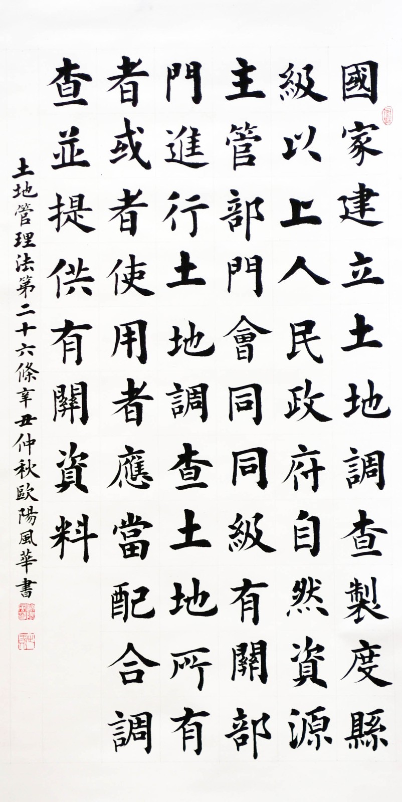 繼1600余位書法家參與書寫《中華人民共和國民法典》全部1260條法條之后,法治日報社聯(lián)合自然資源部法規(guī)司、自然資源部書畫研究會和北京昌平書法家協(xié)會,將筆端對準土地管理“一法一條例”,即《中華人民共和國土地管理法》和《中華人民共和國土地管理法實施條例》。