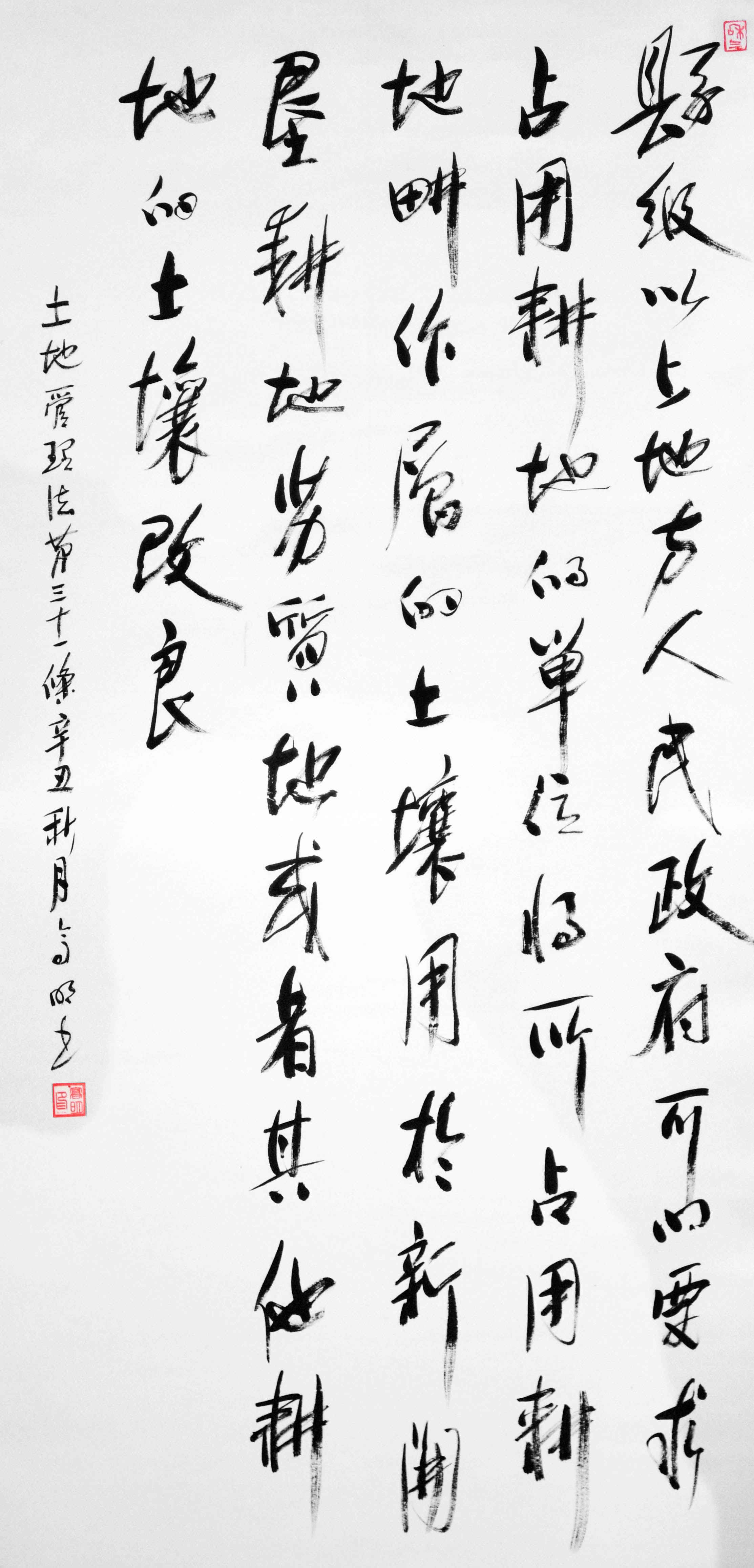 繼1600余位書法家參與書寫《中華人民共和國民法典》全部1260條法條之后,法治日報社聯(lián)合自然資源部法規(guī)司、自然資源部書畫研究會和北京昌平書法家協(xié)會,將筆端對準(zhǔn)土地管理“一法一條例”,即《中華人民共和國土地管理法》和《中華人民共和國土地管理法實施條例》。
