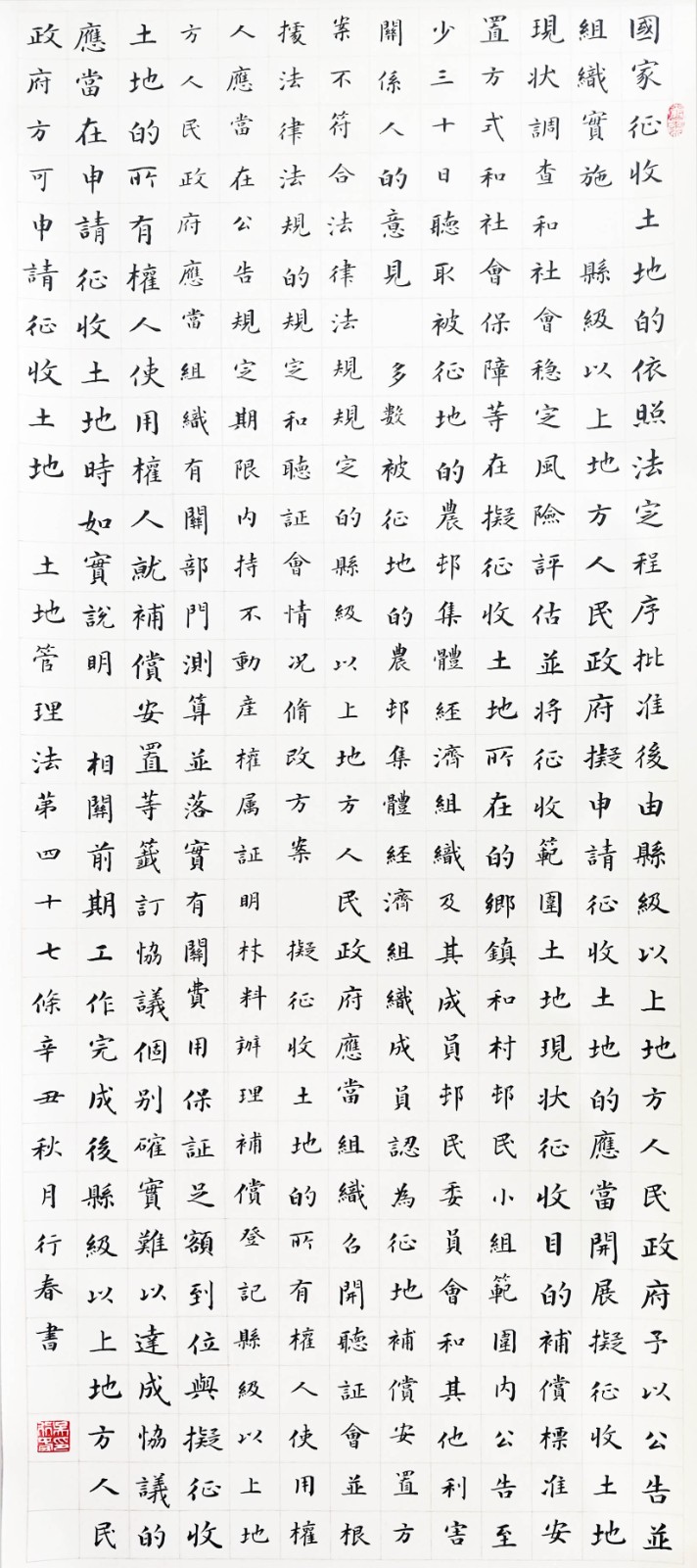 繼1600余位書法家參與書寫《中華人民共和國民法典》全部1260條法條之后,法治日?qǐng)?bào)社聯(lián)合自然資源部法規(guī)司、自然資源部書畫研究會(huì)和北京昌平書法家協(xié)會(huì),將筆端對(duì)準(zhǔn)土地管理“一法一條例”,即《中華人民共和國土地管理法》和《中華人民共和國土地管理法實(shí)施條例》。
