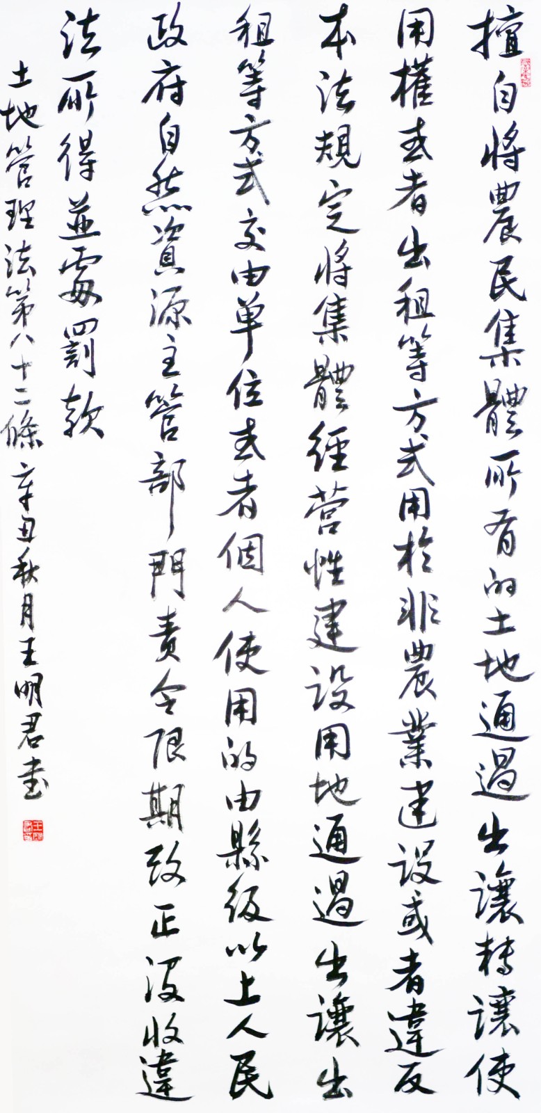 繼1600余位書法家參與書寫《中華人民共和國民法典》全部1260條法條之后,法治日?qǐng)?bào)社聯(lián)合自然資源部法規(guī)司、自然資源部書畫研究會(huì)和北京昌平書法家協(xié)會(huì),將筆端對(duì)準(zhǔn)土地管理“一法一條例”,即《中華人民共和國土地管理法》和《中華人民共和國土地管理法實(shí)施條例》。