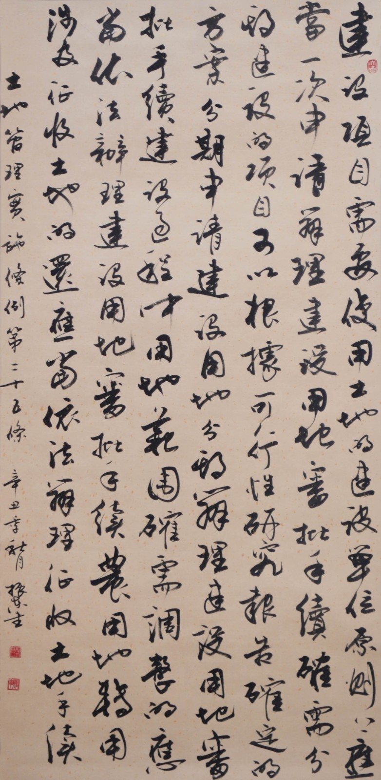 繼1600余位書法家參與書寫《中華人民共和國民法典》全部1260條法條之后,法治日?qǐng)?bào)社聯(lián)合自然資源部法規(guī)司、自然資源部書畫研究會(huì)和北京昌平書法家協(xié)會(huì),將筆端對(duì)準(zhǔn)土地管理“一法一條例”,即《中華人民共和國土地管理法》和《中華人民共和國土地管理法實(shí)施條例》。
