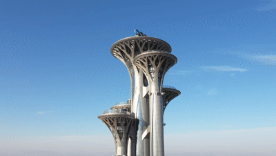 △首鋼滑雪大跳臺(tái)的造型設(shè)計(jì)融入了敦煌壁畫中的“飛天”元素,建筑曲線優(yōu)美、流暢。(總臺(tái)央視記者劉岳拍攝)