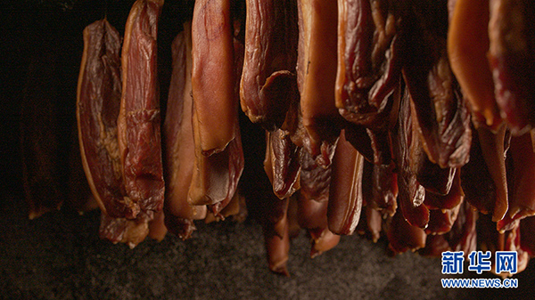 趙友安的炕房掛滿了精心制作的臘肉。新華網(wǎng) 翟亦平 攝