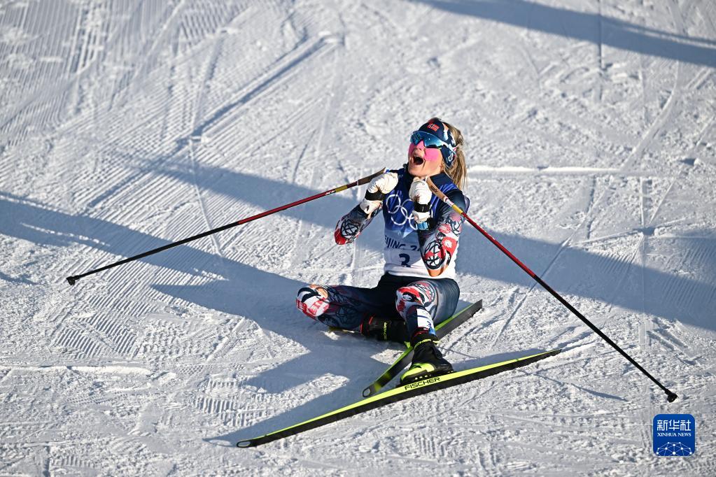 2月5日,挪威選手特蕾絲·約海于格慶祝奪冠。