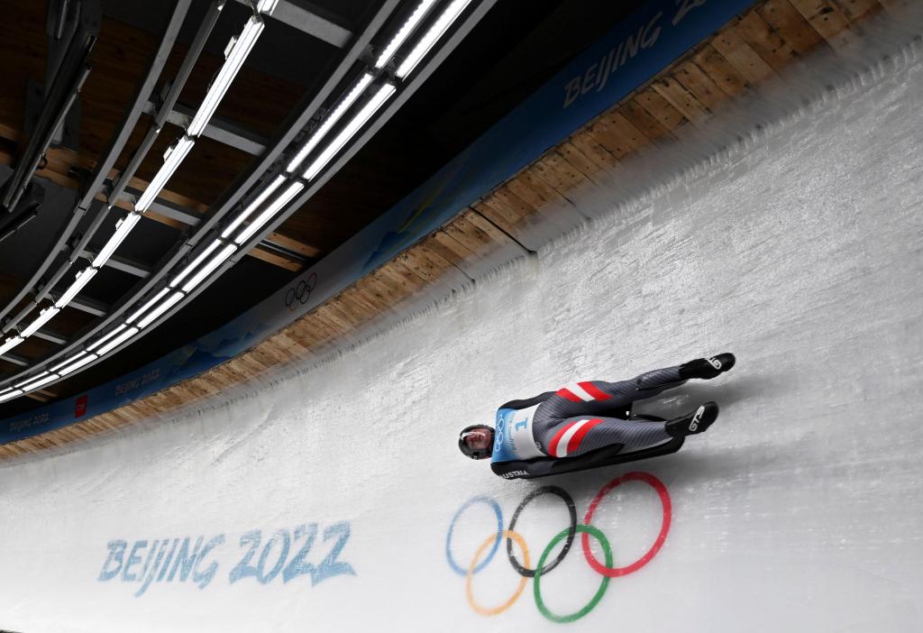 2月5日,奧地利選手沃爾夫?qū)そ鸬聽栐诒本?022年冬奧會男子單人雪橇項(xiàng)目比賽中。新華社記者 賀長山 攝