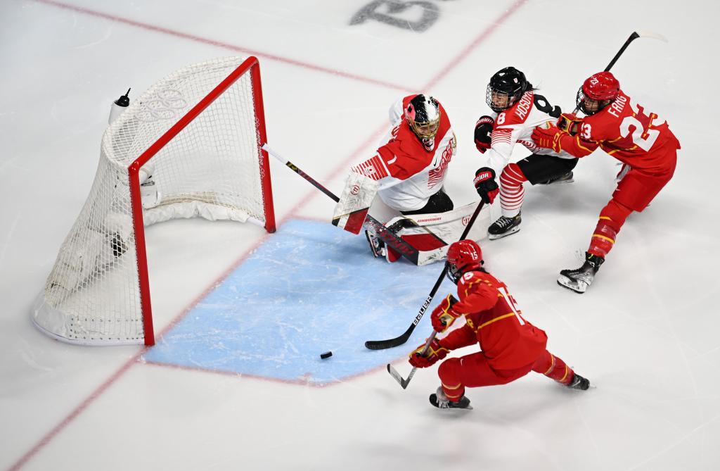 2月6日,中國隊球員胡寶珍(下)在北京2022年冬奧會女子冰球小組賽中破門。新華社記者李尕攝