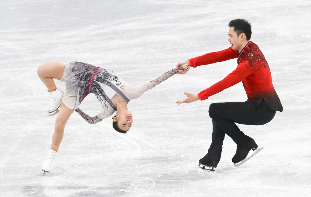 2月7日,中國(guó)選手彭程(左)、金楊在北京2022年冬奧會(huì)花樣滑冰團(tuán)體賽雙人滑自由滑比賽中。新華社記者劉瀟攝
