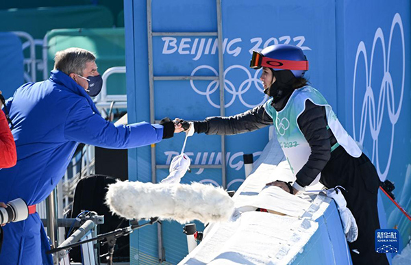 2月8日,國(guó)際奧委會(huì)主席巴赫(左)向中國(guó)選手谷愛(ài)凌表達(dá)祝賀。