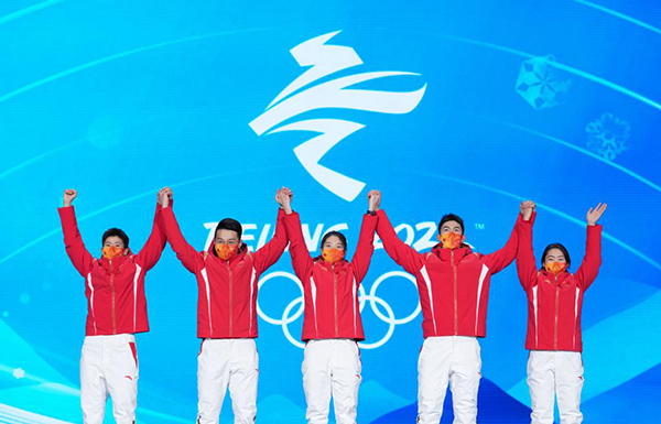 2月6日,中國(guó)隊(duì)選手范可新、任子威、曲春雨、武大靖、張雨婷(從左至右)在北京2022年冬奧會(huì)短道速滑混合團(tuán)體接力獎(jiǎng)牌頒發(fā)儀式上。新華社記者鞠煥宗攝
