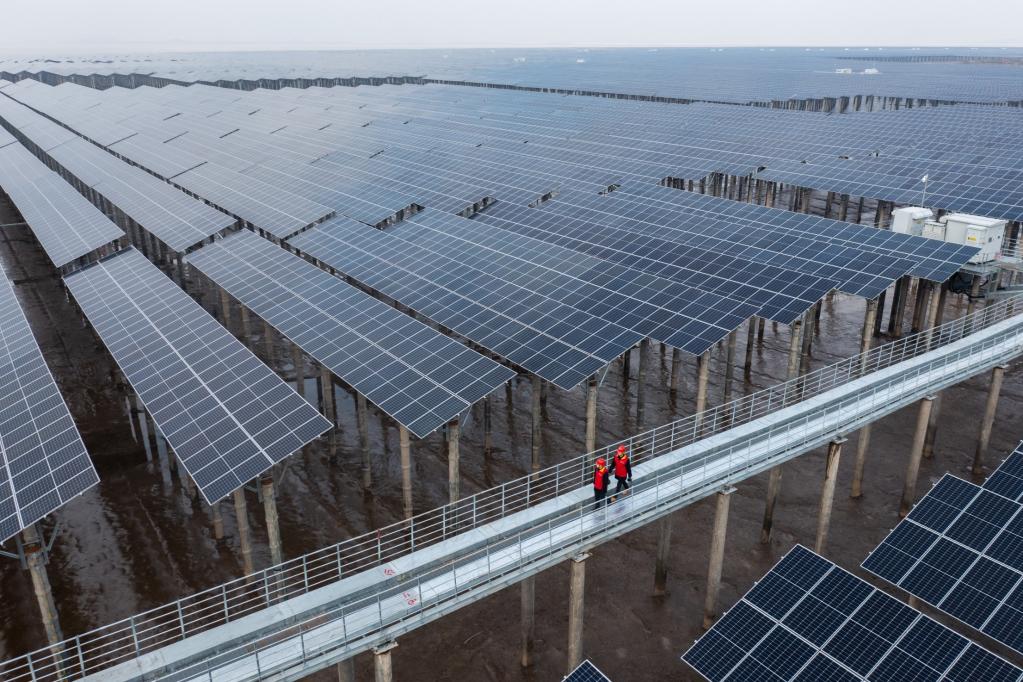 圖為2021年12月29日拍攝的浙江省寧波市象山縣長(zhǎng)大涂灘涂光伏項(xiàng)目(無人機(jī)照片)。(新華社記者徐昱攝)