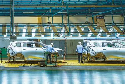在海南省海馬汽車海口基地的焊裝車間內,工人進行流水線作業(yè)。